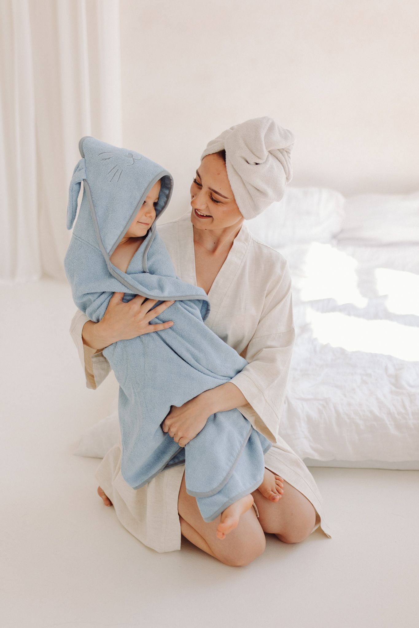 - Ręczniczki z kapturkami dla niemowląt i turbany kąpielowe dla mam - wykonane z miękkiej i niezwykle chłonnej frotte bambusowej, zadbają o Waszą naturalną pielęgnację po kąpieli i pozwolą stworzyć uroczy zestaw na wspólne rytuały po kąpieli.