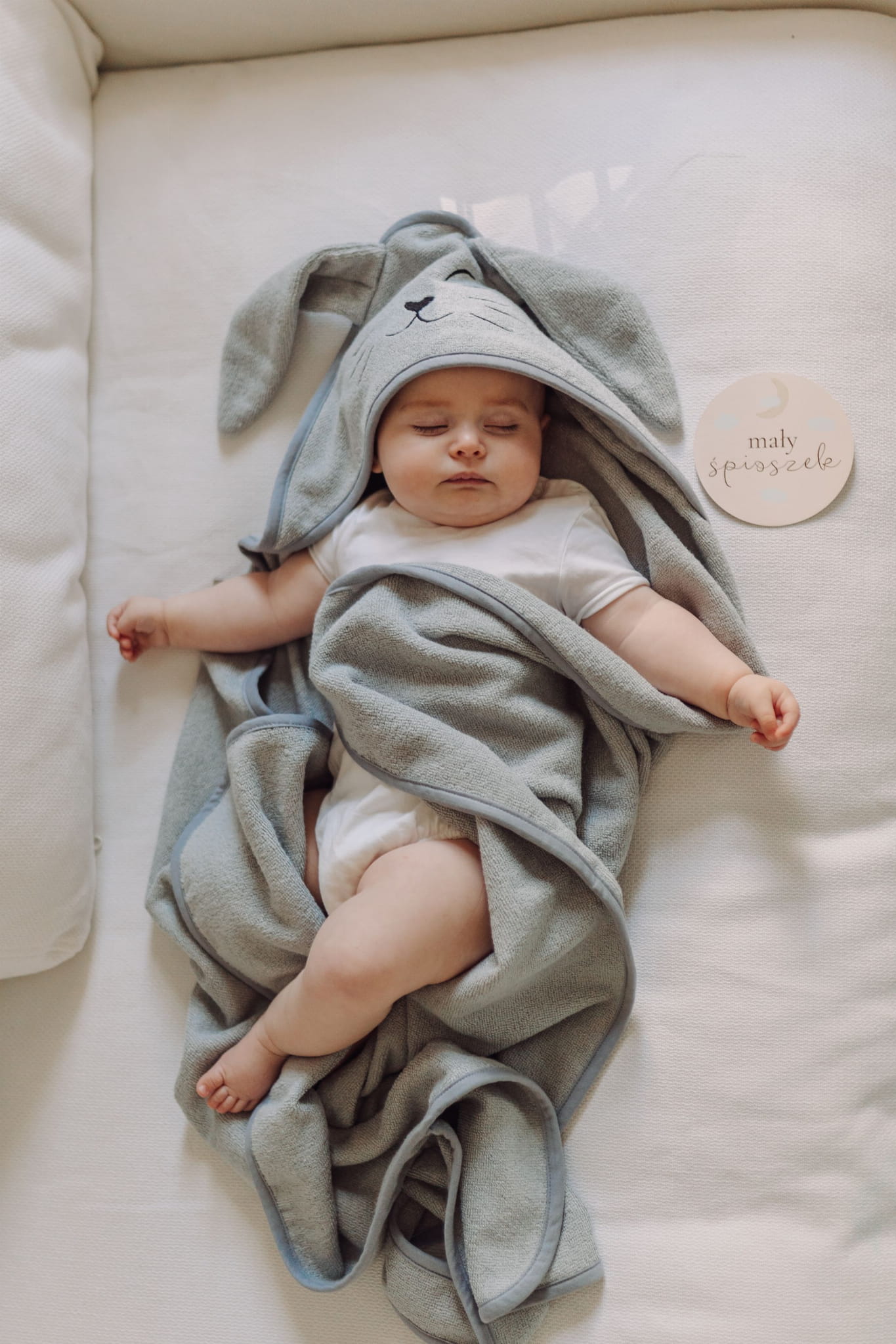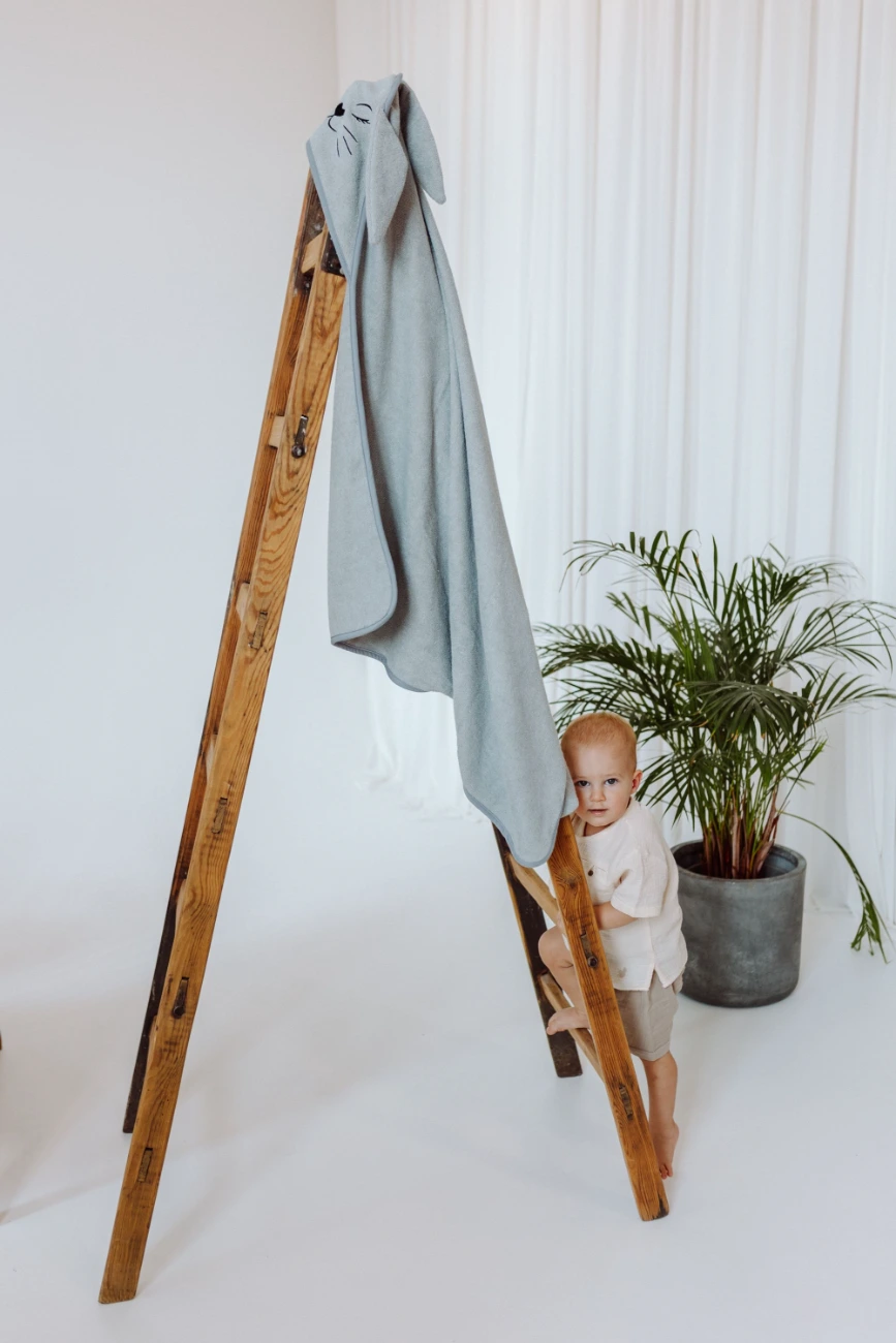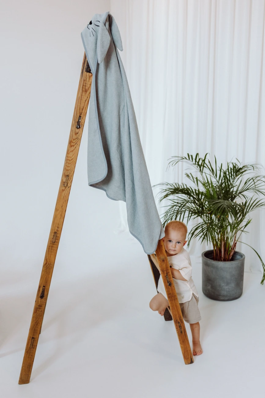 Przedstawiamy okrycie kąpielowe w rozmiarze 85x85 cm z haftowanym kapturkiem w kształcie Króliczka, wykonane z niezwykle miękkiej i chłonnej frotte bambusowej.