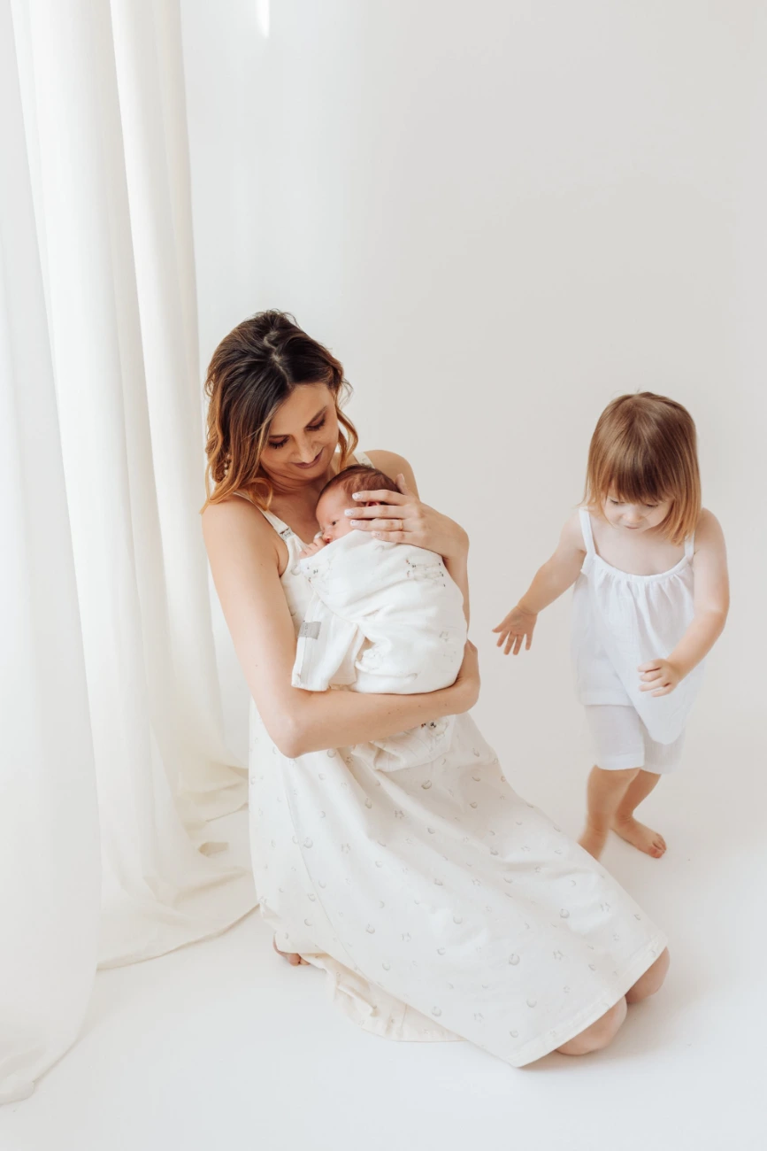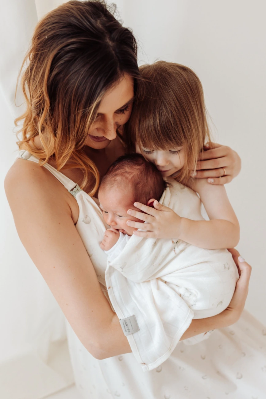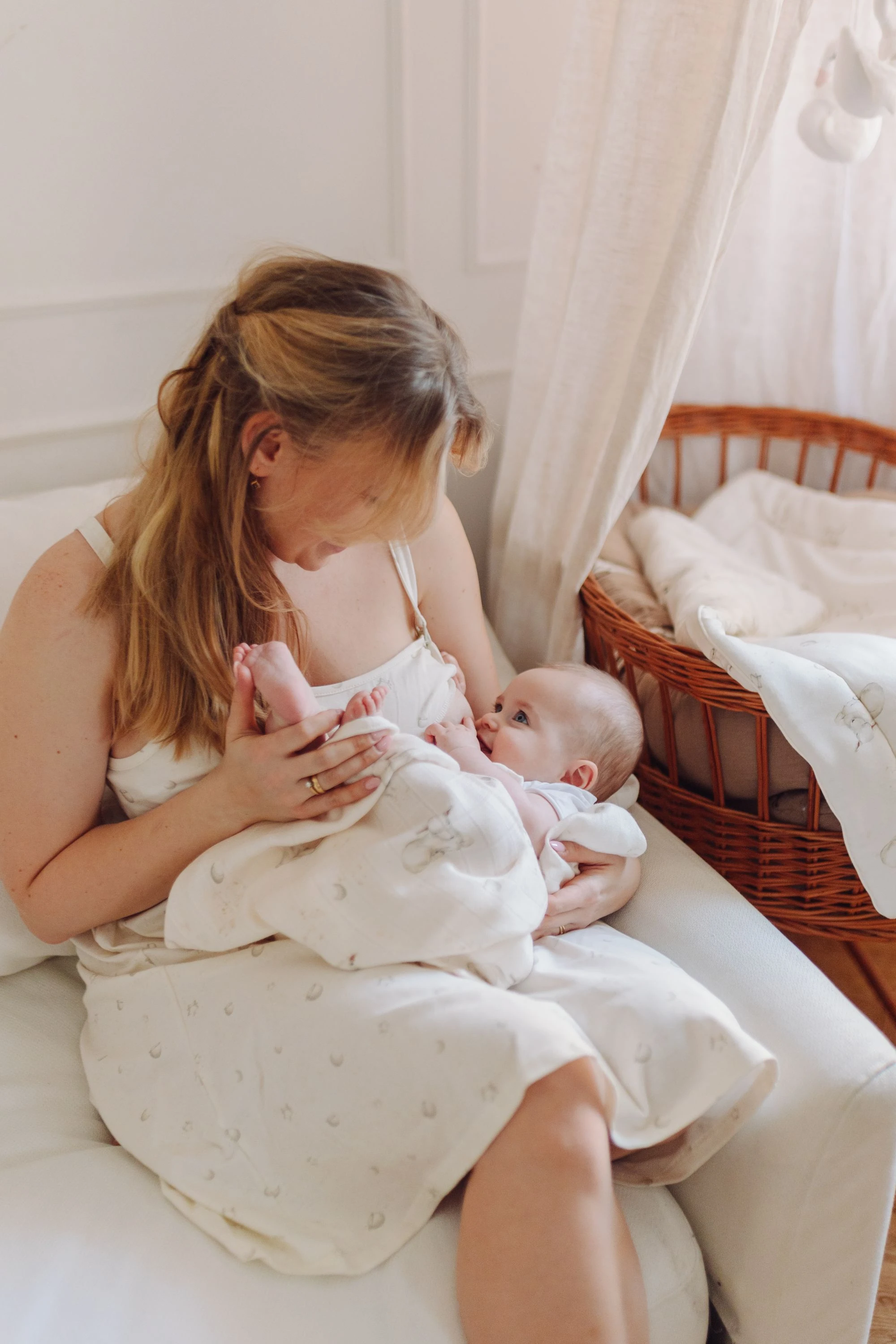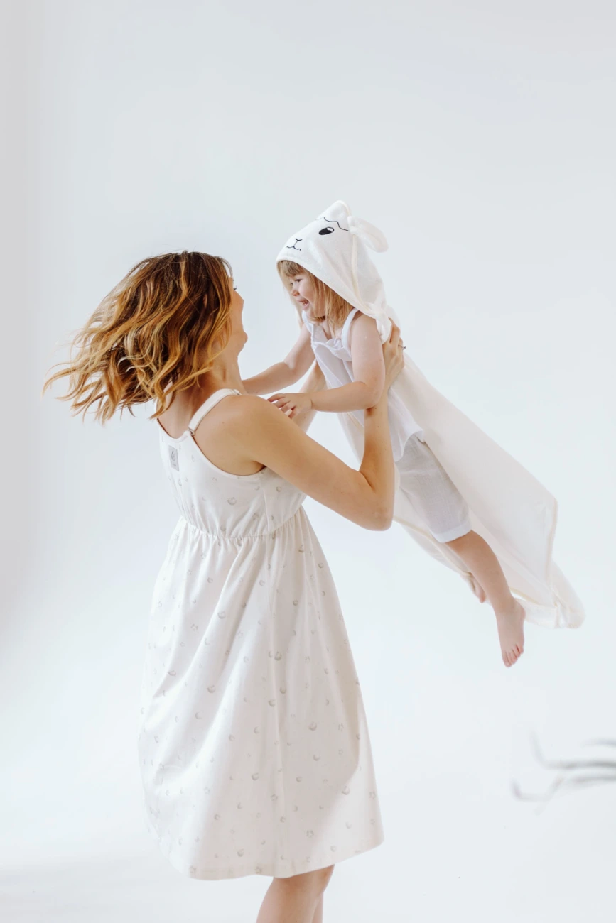 Przedstawiamy koszulę nocną do karmienia zdobioną subtelnym, ręcznie malowanym wzorem gwiazdek i księżyców z kolekcji dedykowanej mamie i dziecku Niebiańskie Owieczki, zaprojektowanej z myślą, aby podkreślić wyjątkową więź, jaka ich łączy.
