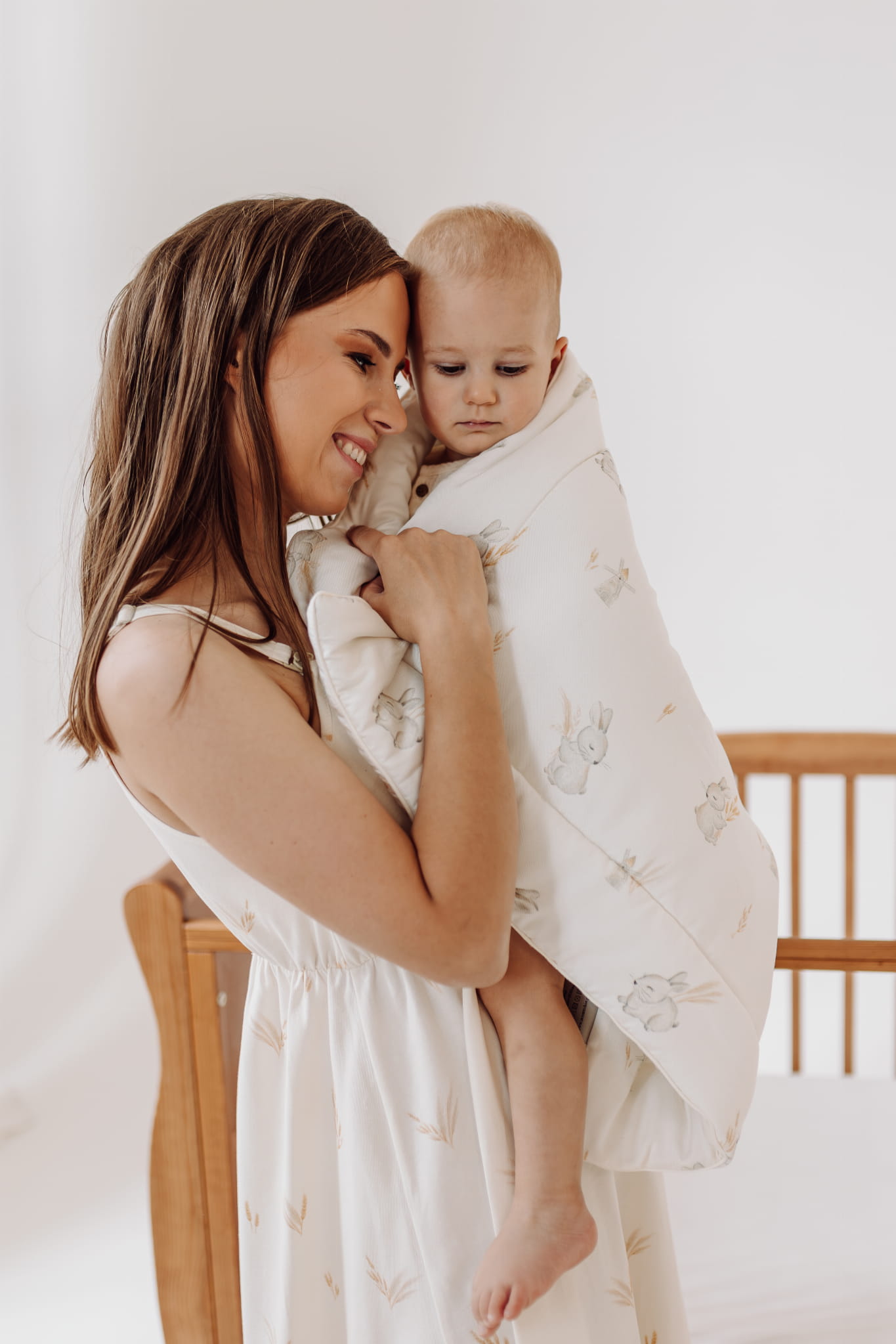 Przedstawiamy koszulę nocną do karmienia zdobioną subtelnym, ręcznie malowanym wzorem kłosów zbóż z kolekcji dedykowanej mamie i dziecku Królicza Wioska, zaprojektowanej z myślą, aby podkreślić wyjątkową więź, jaka ich łączy.
