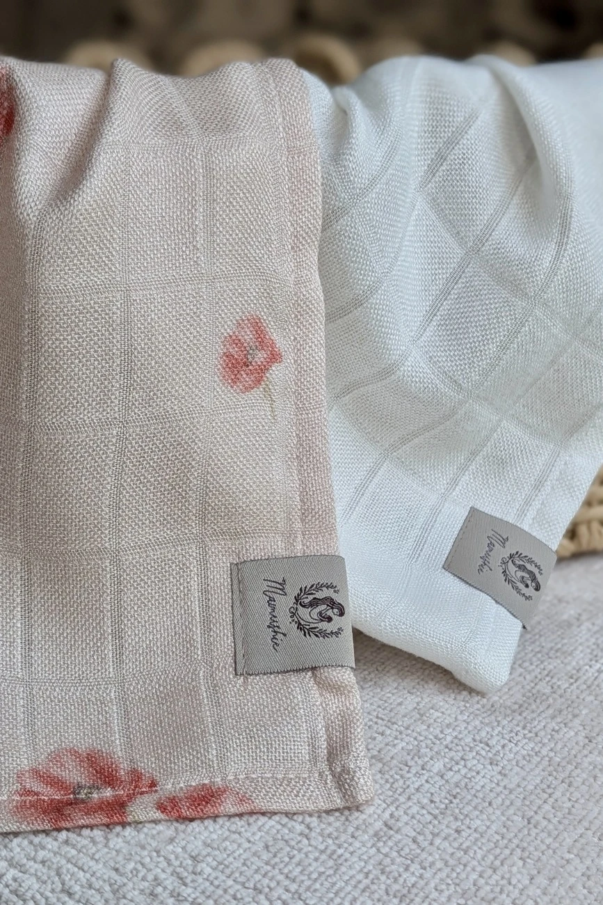W skład dwupaku wchodzi pieluszka zdobiona autorskim wzorem ręcznie malowanych polnych maków z kolekcji Makurki oraz gładka pieluszka w kolorze ecru.