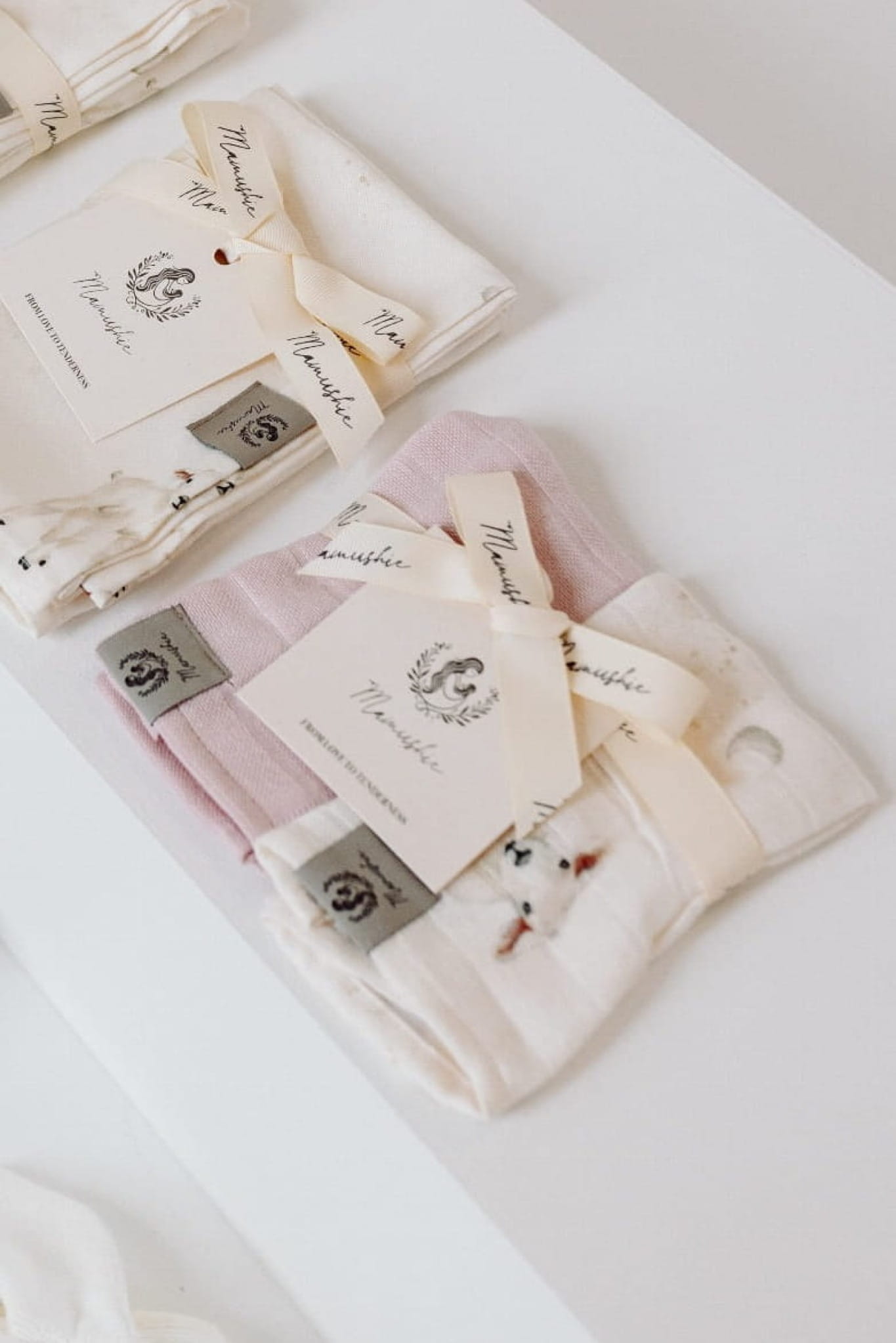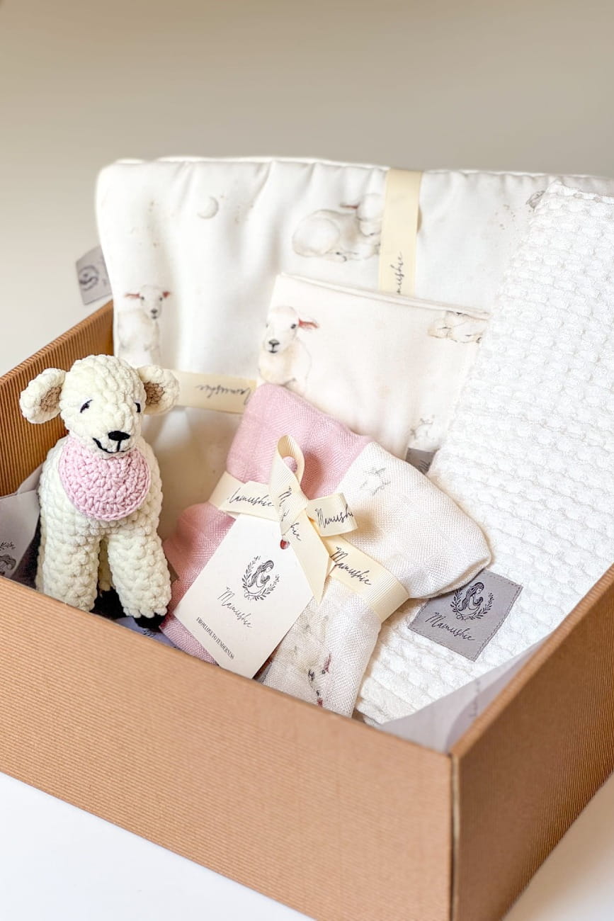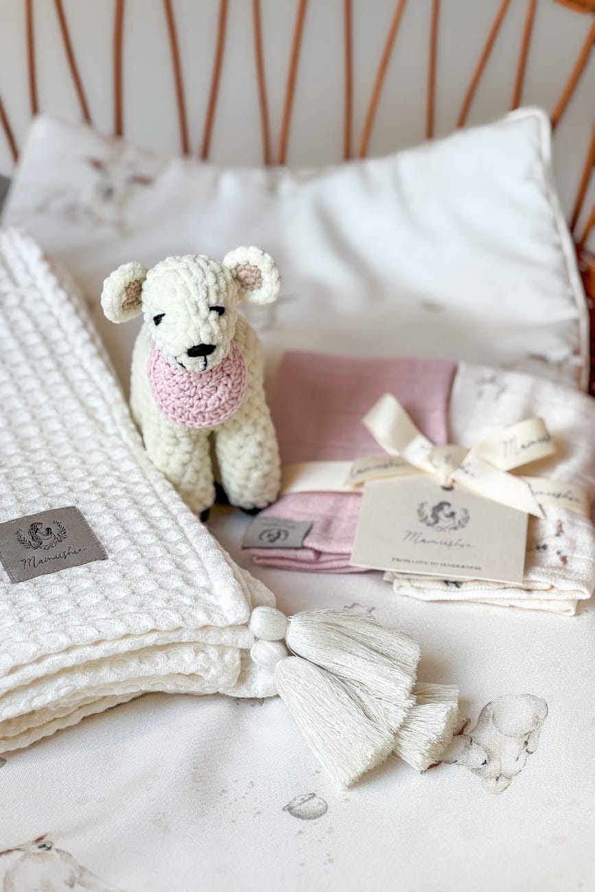 W skład dwupaku wchodzi pieluszka zdobiona autorskim wzorem ręcznie malowanych owieczek na tle księżycowego nieba oraz gładka pieluszka w kolorze pudrowego różu.