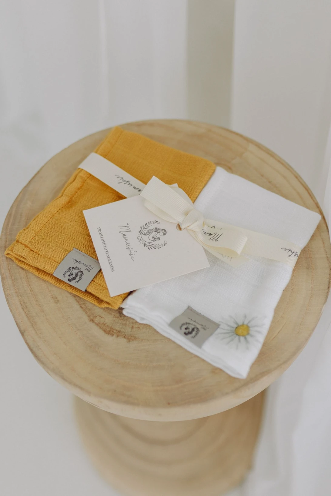 W skład dwupaku wchodzi pieluszka zdobiona autorskim wzorem ręcznie malowanych polnych stokrotek oraz gładka pieluszka w kolorze miodowym.