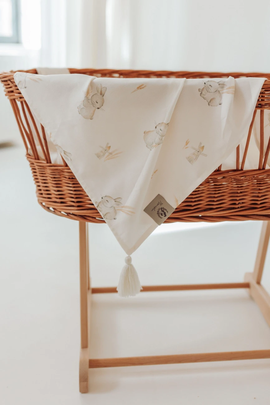 Otulacz zdobiony jest pięknym, autorskim wzorem ręcznie malowanych króliczków, trzymających w łapkach kłosy zbóż. Miękka i delikatna tkanina bambusowa w połączeniu z niepowtarzalnym, sielankowym designem zapewnią Twojemu dziecku słodkie i spokojne sny.