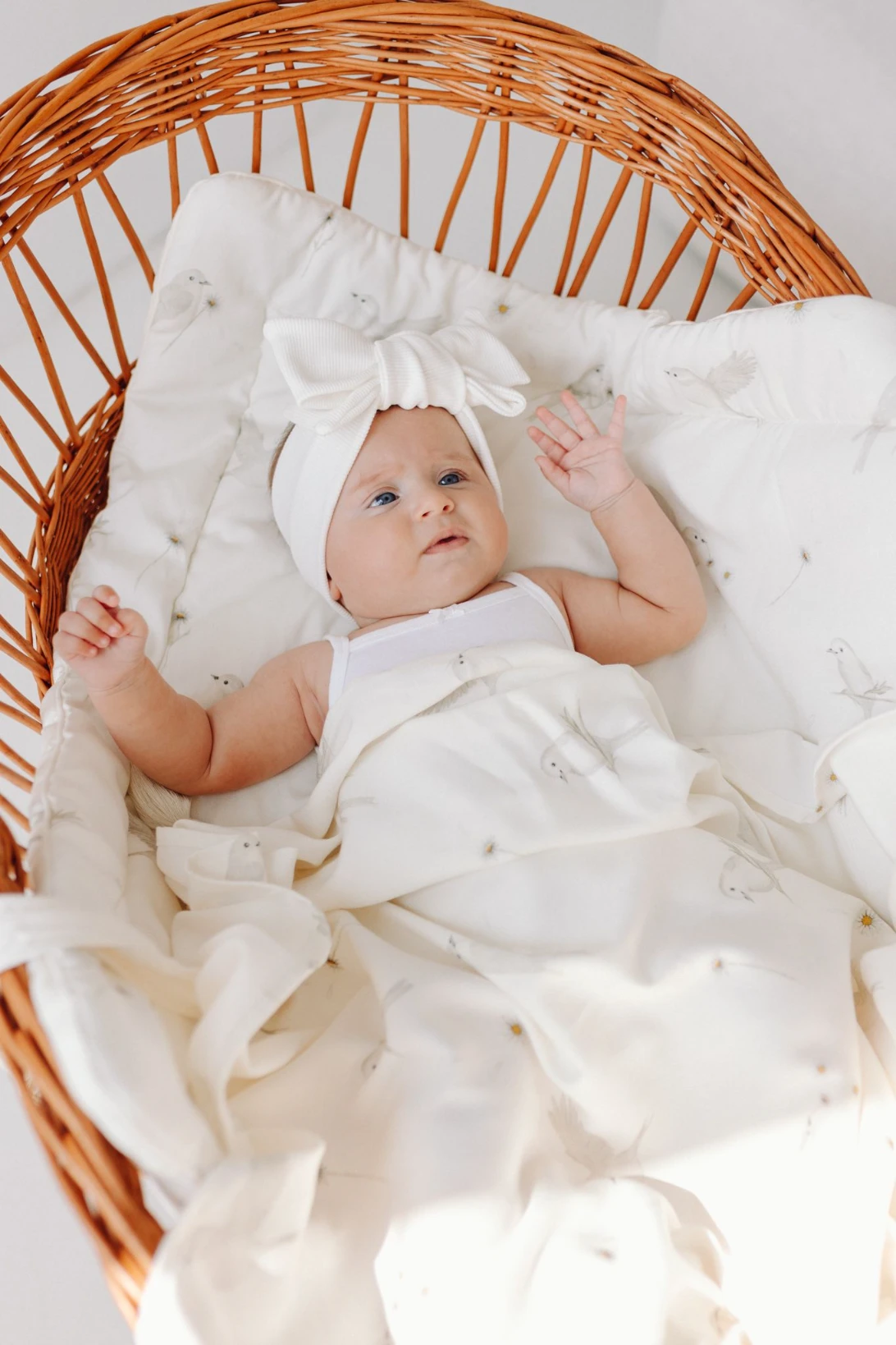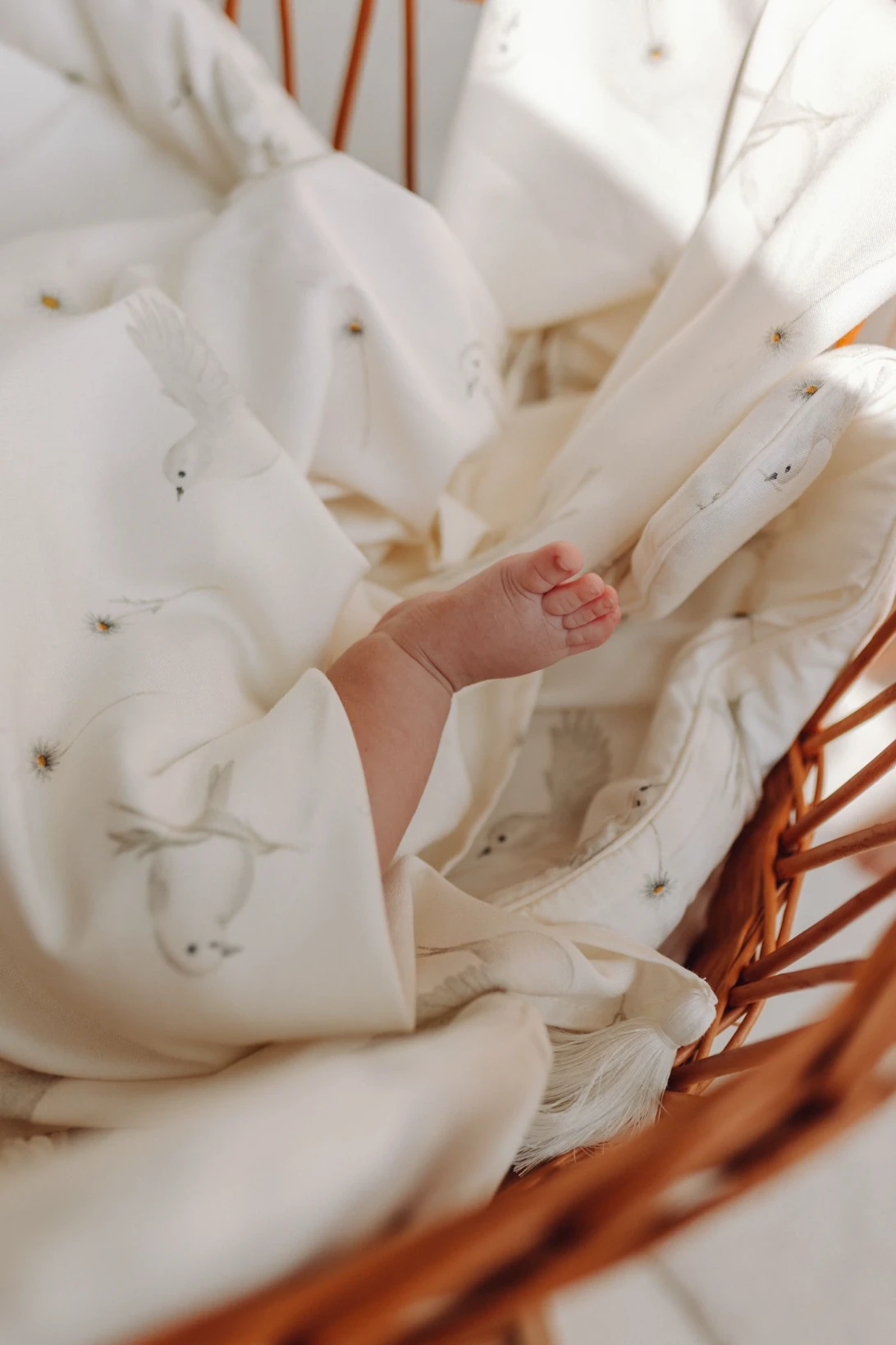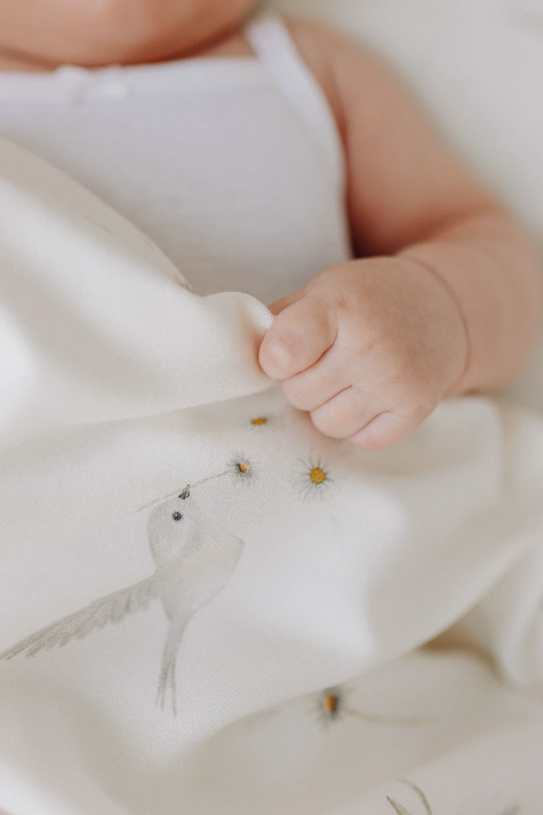 Otulacz zdobiony pięknym, autorskim wzorem ręcznie malowanych ptaszków i polnych stokrotek. Miękka i delikatna tkanina bambusowa w połączeniu z niepowtarzalnym designem zapewnią Twojemu dziecku słodkie i spokojne sny.