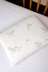 Podusia zdobiona jest autorskim wzorem ręcznie malowanych ptaszków i polnych stokrotek. Miękka i delikatna tkanina bambusowa w połączeniu z niepowtarzalnym designem, zapewnią Twojemu dziecku komfort wypoczynku oraz słodkie i spokojne sny.