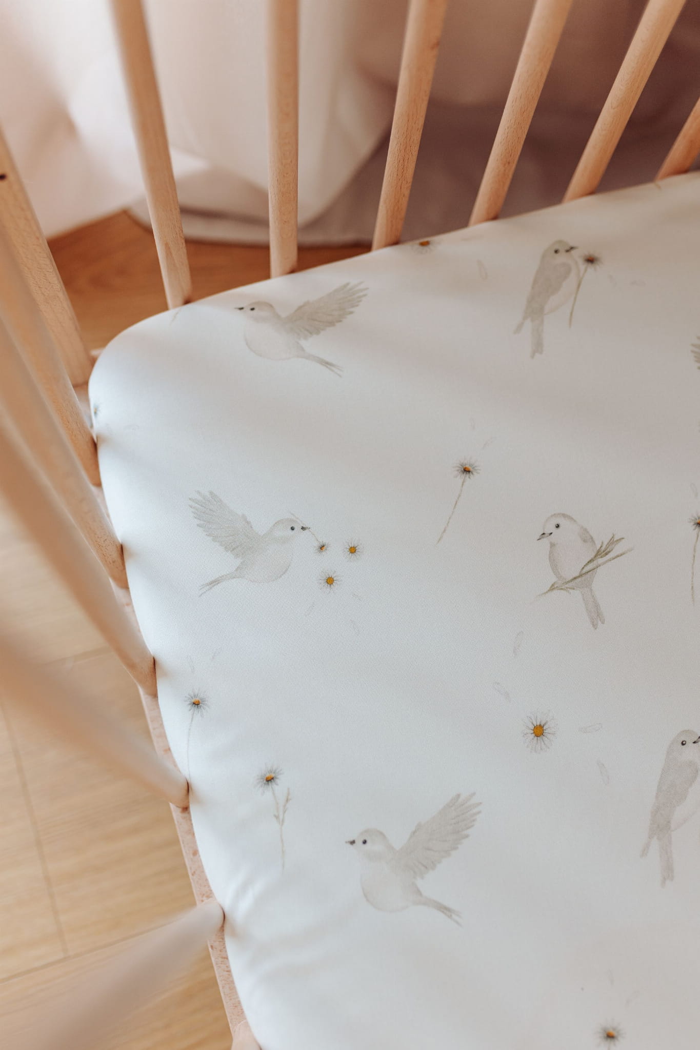 Prześcieradło zdobione jest pięknym, autorskim wzorem ręcznie malowanych ptaszków oraz polnych stokrotek. Miękka i delikatna tkanina bambusowa w połączeniu z niepowtarzalnym designem zapewnią Twojemu dziecku słodkie i spokojne sny.