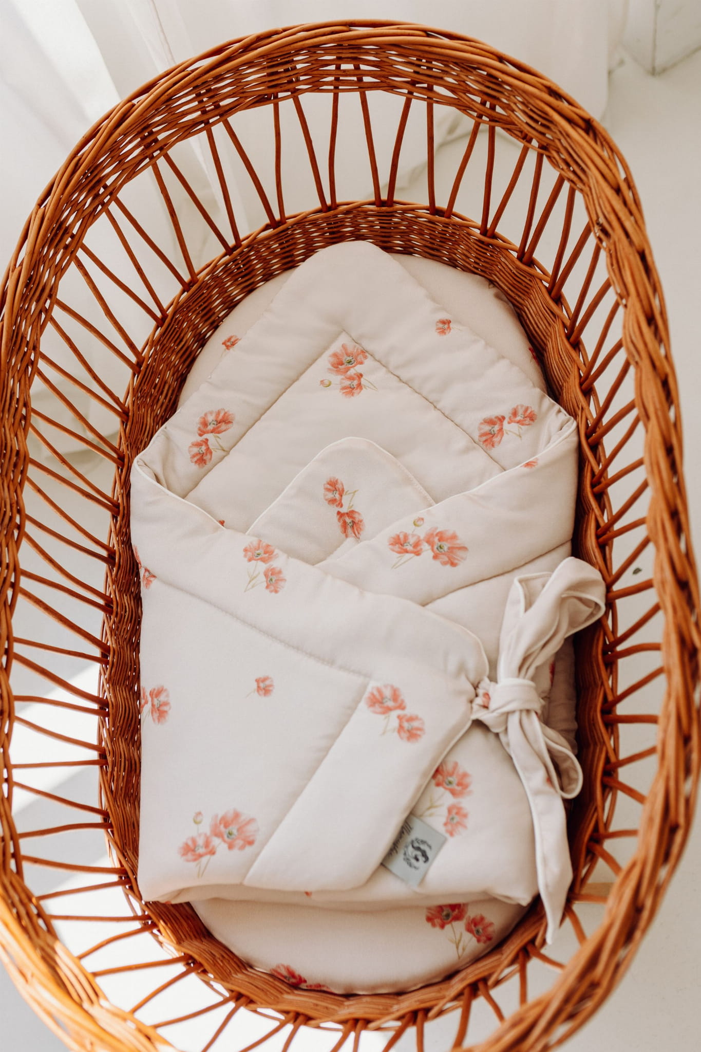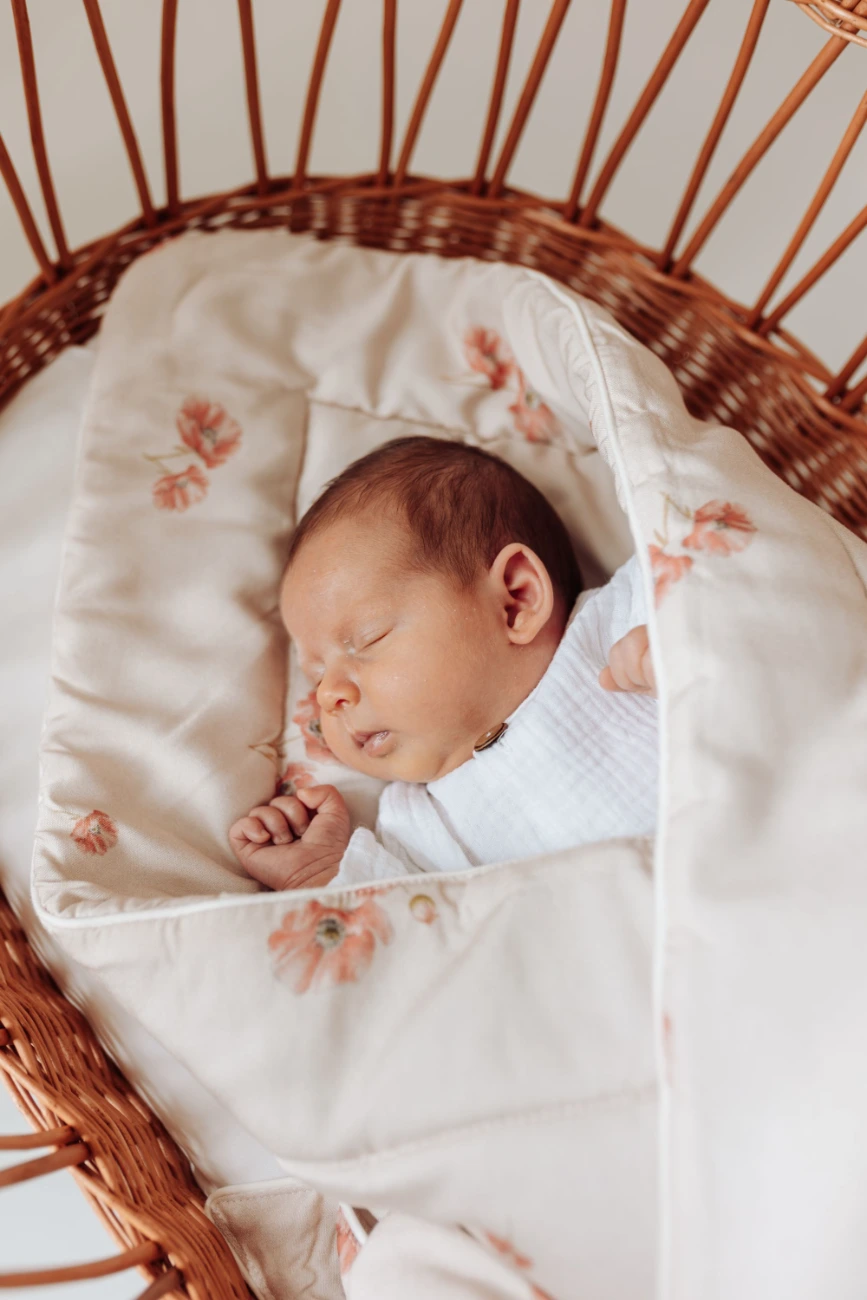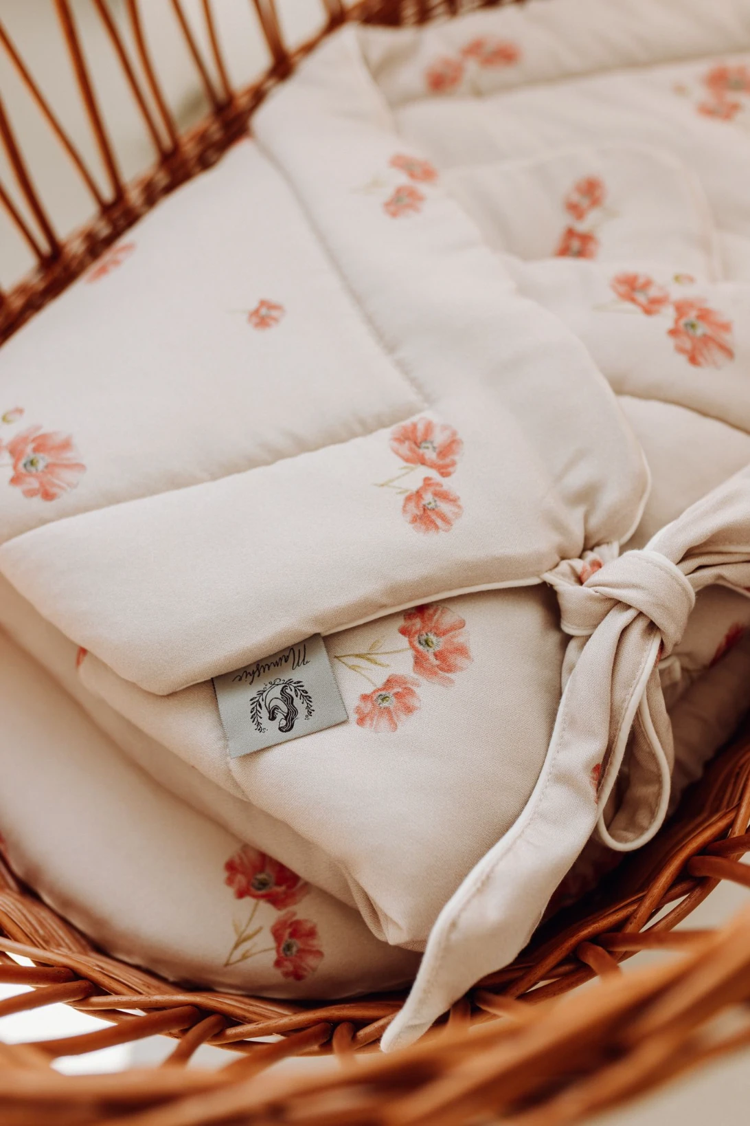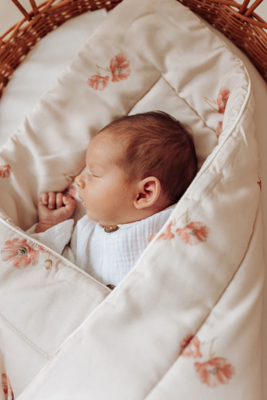 Rożek zdobiony jest autorskim wzorem ręcznie malowanych polnych maków. Miękka i delikatna tkanina bambusowa w połączeniu z niepowtarzalnym designem, zapewnią Twojemu dziecku komfort wypoczynku oraz słodkie i spokojne sny.