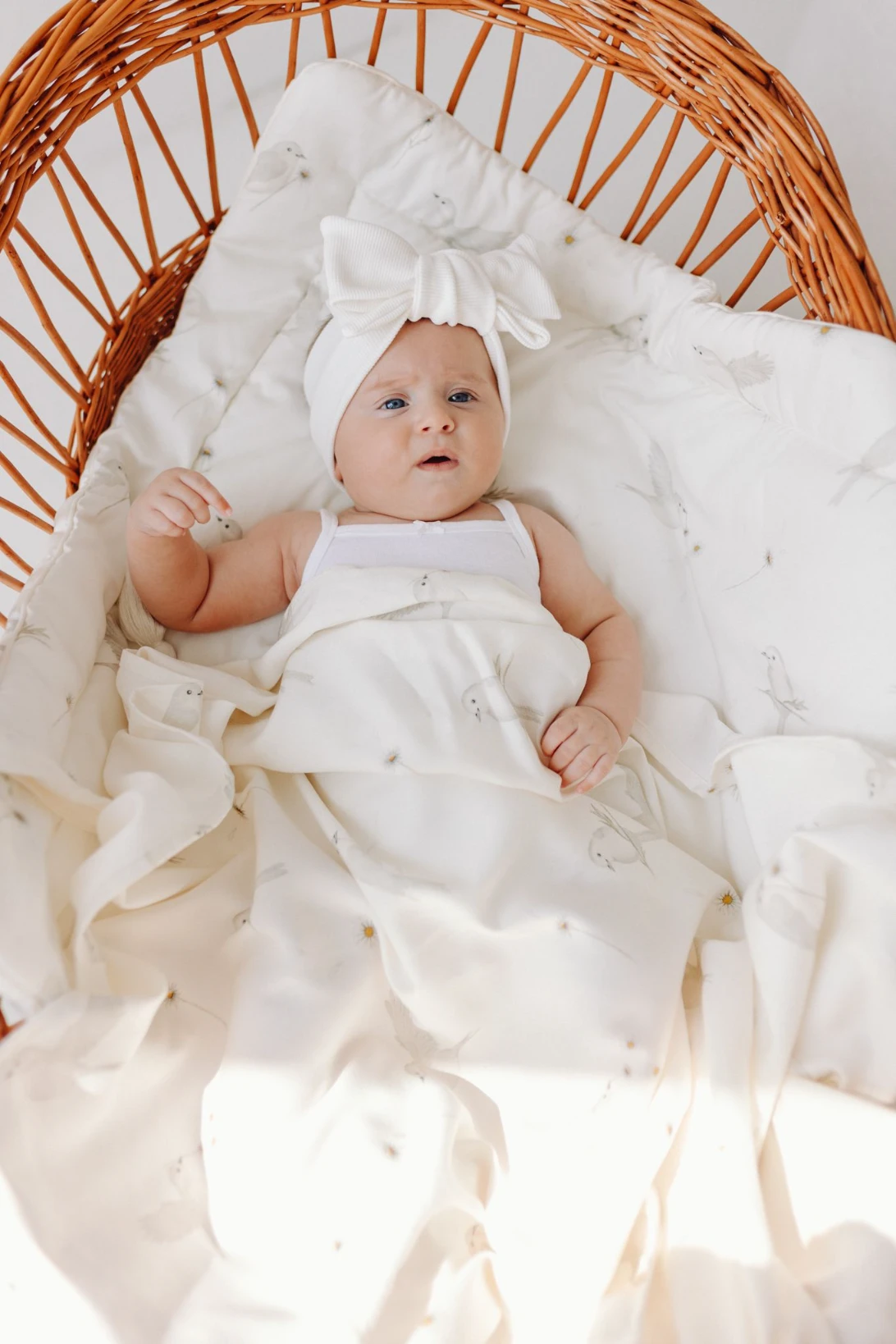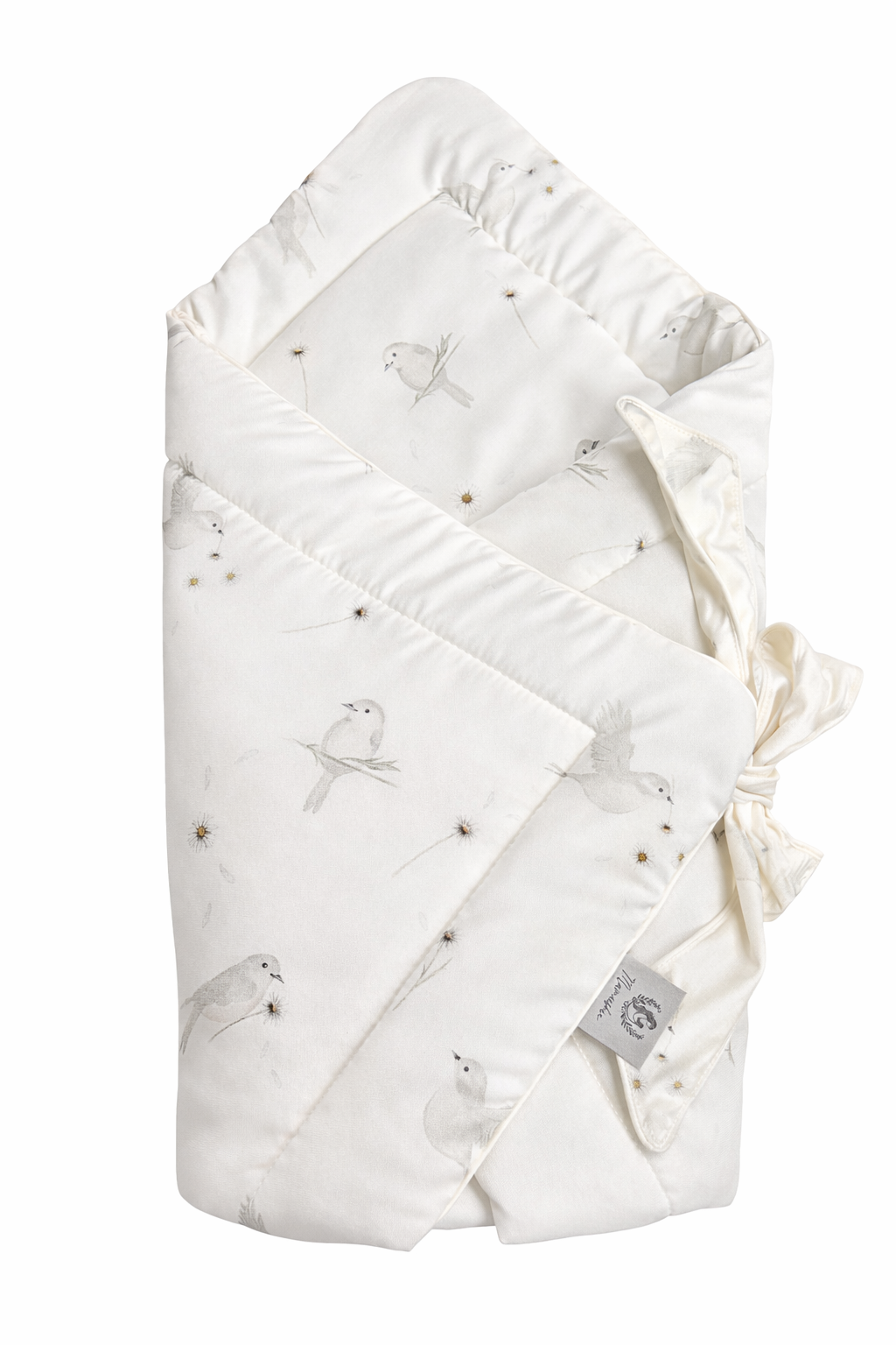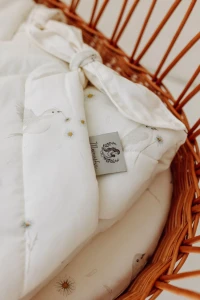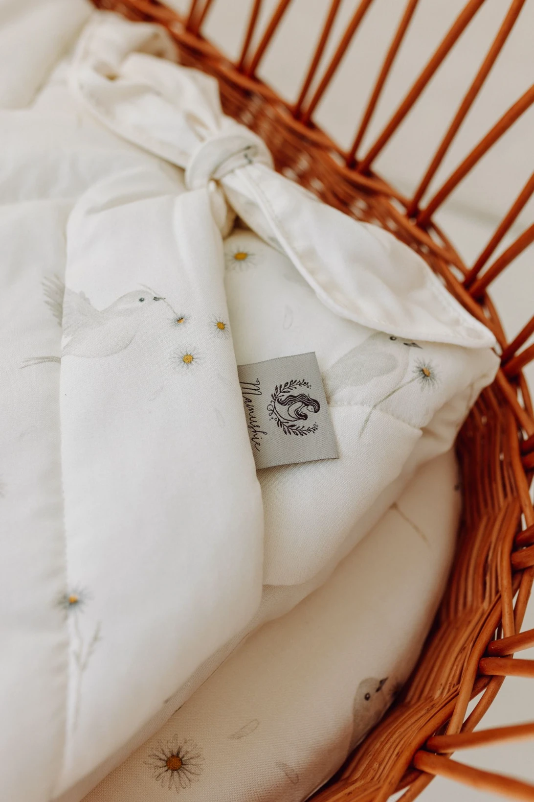 Rożek zdobiony jest autorskim wzorem ręcznie malowanych ptaszków oraz polnych stokrotek. Miękka i delikatna tkanina bambusowa w połączeniu z niepowtarzalnym designem, zapewnią Twojemu dziecku komfort wypoczynku oraz słodkie i spokojne sny.