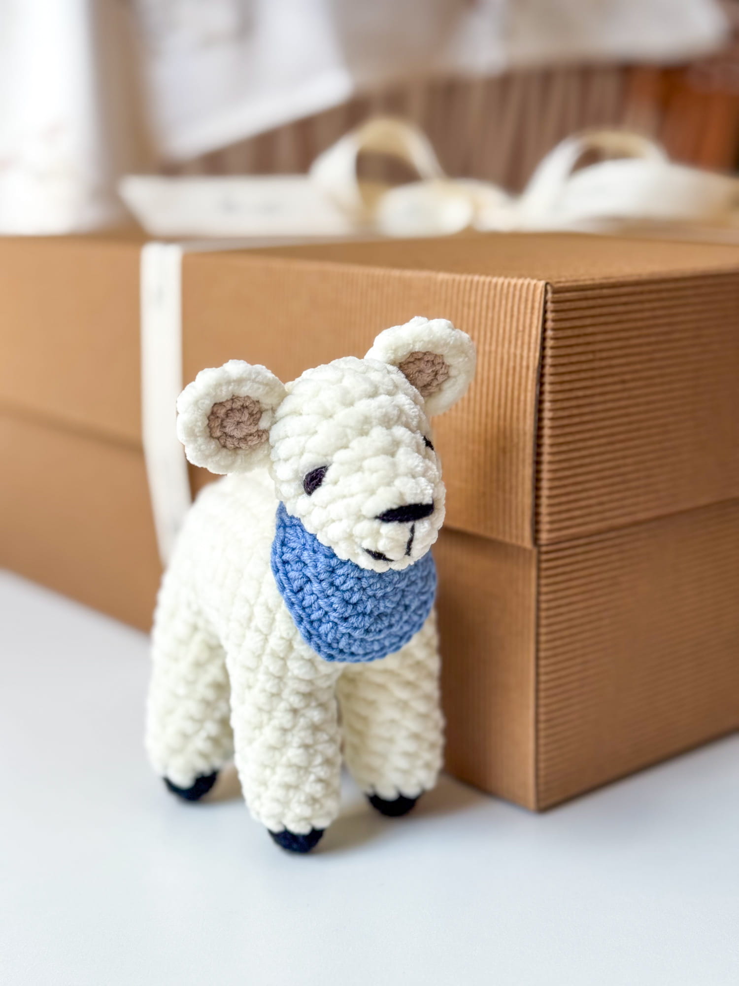 Urocze dopełnienie naszego zestawu prezentowego. Miękka, szydełkowa owieczka z haftowanymi oczkami, wykonana w 100% w Polsce z pluszowej włóczki Himalaya Dolphin Baby z certyfikatem OEKO-TEX® Standard 100. Będzie piękną dekoracją dziecięcego pokoiku.